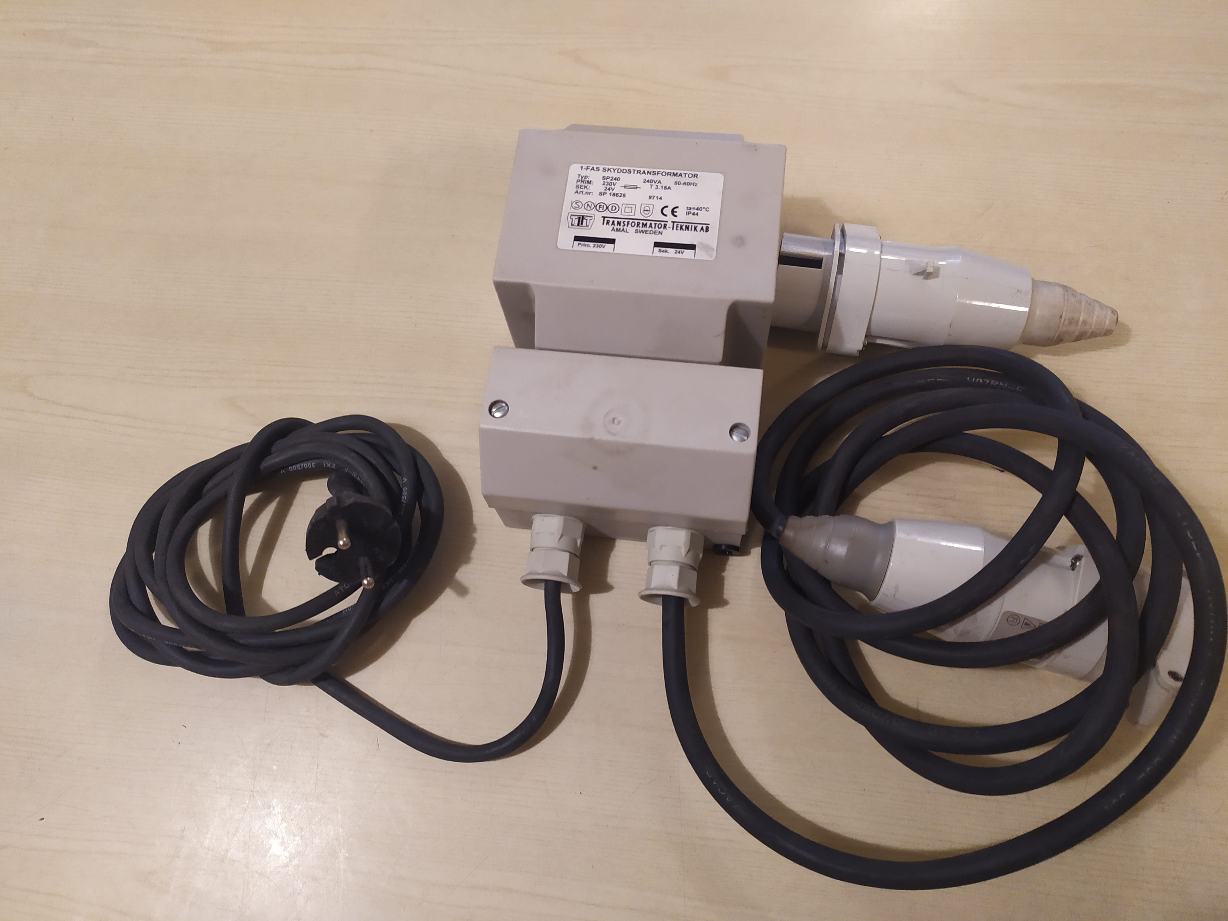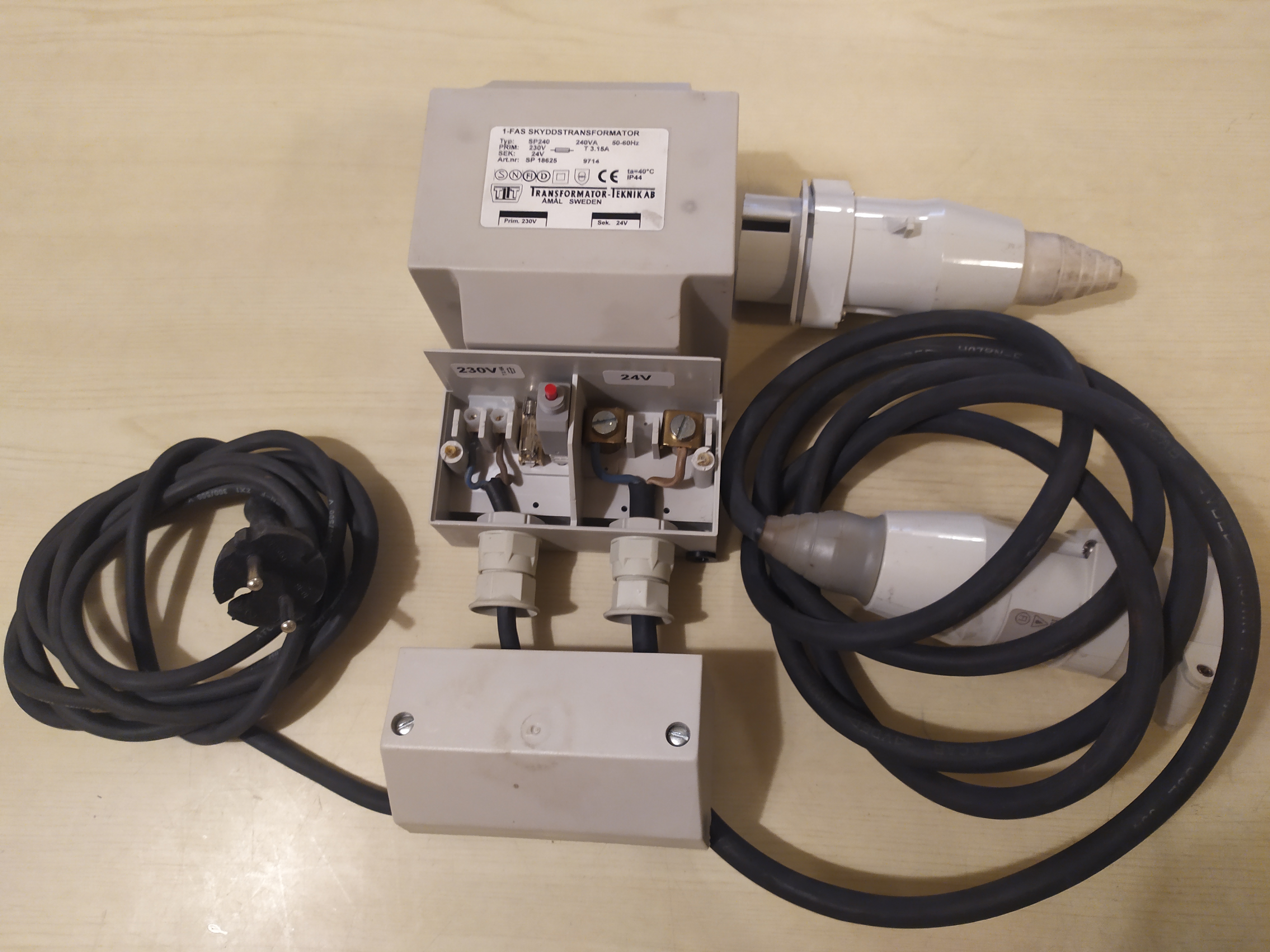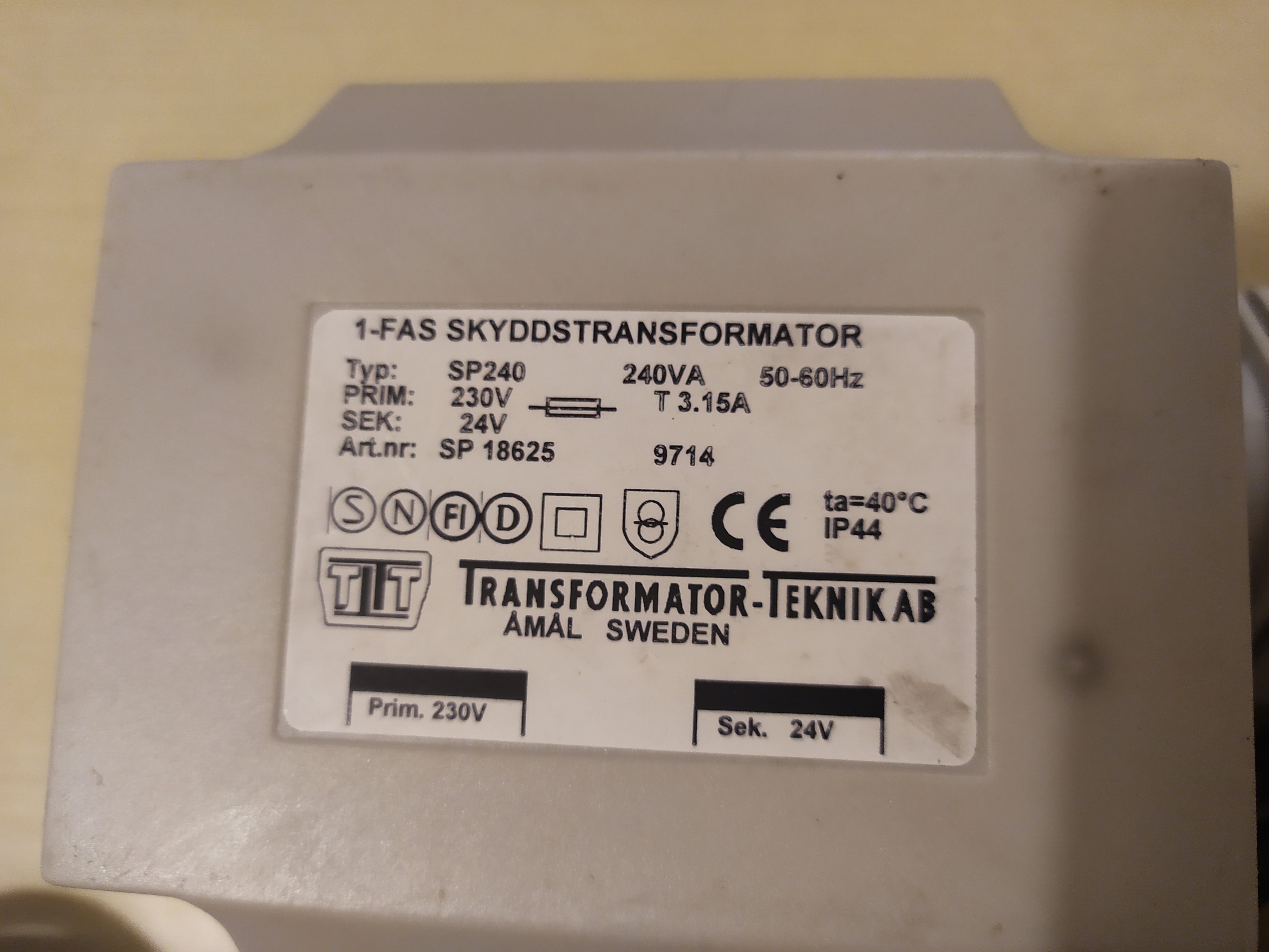 Transformator Prim 230V / Sek 24V med säkring 3.15 A Transformator Teknik SP 18625 Med sladdar och hona och hane . Ej använd Nyskick  Pris per st . 200:-SEK + frakt  + moms  Antal 5 st