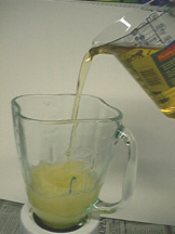 After the Lye has completly dissolved into the methanol (about 2 minutes), add 1 liter of vegetable oil to the blender. Blend on low speed for 20 to 30 minutes. The ideal speed for this process just barely creates a vortex or "tornado" in the oil without spashing the mixture around or frothing it up.