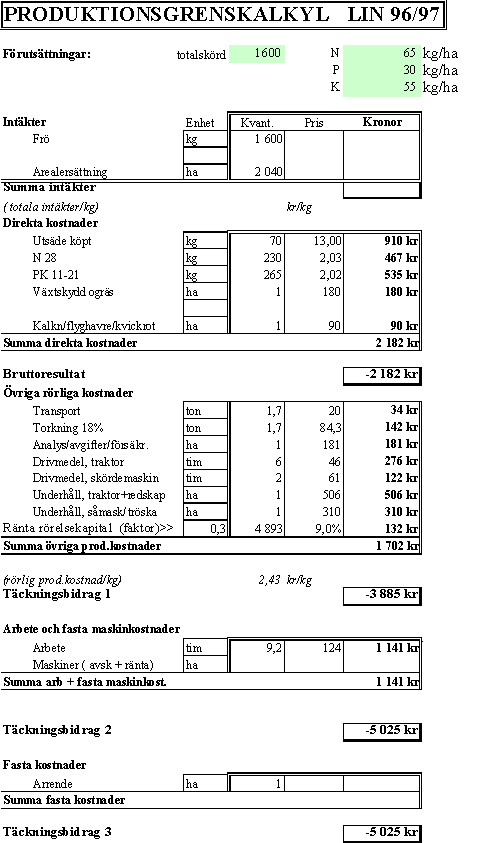 Oljelinet skördetröskas. Skörden av spånadslin bör ske på gulmognadstadiet, som inträffar 30-35 dagar efter full blomning och spånadslinet skördas alltså före oljelinet. Skörd görs genom handryckning eller med speciella maskiner som skall köras ganska snabbt. Olika maskintillverkare experimenterar med fiberfriläggning på fält. Linprocessorn processar linhalmen och pressar högdensitetsbalar. Dessa balar innehåller 90 % fiber och 10 % skävor. Innan processning är förhållandet i vikt 25 % fibrer och 75 % skävor. Dessa kortfibrer är dock ej av samma kvalitet som fiber som processas i en kortfiberfabrik. (Rosenqvist, 1993). 9. Lagring, transport Oljelinet torkas efter skörden till en vattenhalt på 8%, vilket sker lättare än om spannmål skall torkas till samma vattenhalt. Det är viktig att vattenhalten är låg, då linfröet lätt gror. Även för oljepressning bör linfröet vara ordentligt torrt. Spånadslinhalm som skall processas i fabrik torkas främst på skulltork men förtorkas helst på fält. Med befintlig teknik är hanteringen arbetskrävande och dyr. Med inprocessor minskar halmhanteringen till knappt 30 % eftersom den stora mängden skävor stannar kvar på fältet. Dessutom hanteras halmen i form av storbalar, vilket kan ske maskinellt. 10. Miljöpåverkan I Sverige har gjorts försök att sälja linfrö till hälsokostbranschen. Linet (liksom för övrigt t.ex. solros) har egenskapen att lätt absorbera kadmium från marken. Svenskt linfrö klarar Livsmedelsverkets normer, men man har inom hälsokostbranschen kommit överens om att hålla en nivå, som är högst en tiodel av Livsmedelsverkets norm, vilket har inneburit att svenskt linfrö inte har kunnat säljas till hälsokostaffärerna. De analyser, som har genomförts inom ramen för Örebroprojektet, visar att importerat lin har betydligt lägre kadmiumvärden än svenskt lin. Lin har ett något öppnare växtsätt och konkurrerar sämre med ogräs. Än vårspannmål, varför kemisk bekämpning behövs i minst lika hög grad som i vårspannmål. Avseende kväveläckage bör linoch vårspannmål vara likvärdiga. 11. Produktionskostnadsanalys I Linprojektet i Örebro har prisutvecklingen avspeglat sig på avräkningspriset till odlarna. 1989 kunde Örebroprojektet betala 2,45 kr/kg frö, 1990 1,50 kr/kg och 1991 1,15 kr/kg. 1995-96 varierade priset mellan 1,70 och 2,00 kr/kg. Odlingen har ökat 1997 och avräkningspriset förväntas hamna mellan 1,50 och 1,70 kr/kg. Möjligheten för avsättning av linfrökakan spelar stor roll för prissättningen på fröet. Tidigare har det varit för liten kvantitet och utspridd på för många ställen för att kunna gå in i foderblandningar. Ju större odling desto lättare att få avsättning för linfrökakan. För linodling kan odlaren ansöka om EU-baserad arealersättning, vilken är knappt dubbelt så stor som för spannmål. Betalningsförmågan för kortfibrig oljelinhalm i rundbal eller storbal vid vägkant är 70 -90 öre/kg för användning som byggnadsisolering. Nu sker import av råmaterial till nischprodukter. Det går inte att få EU-stöd för kortfiber-produktion eftersom det ej ingår i EU-systemet CAP och därmed inte har något interventionspris. Inom EU finns ett speciellt marknadsstöd men det går ej att få i Sverige. Prismässigt måste denna produktion konkurrera med konventionella grödor. Den potentiella odlingsarealen är hela Sverige upp till Mälardalen och kvaliteten begränsas inte av odlingsplatsen inom detta område. För fiberproduktion (långfiber) kan odlingsstöd gå till industrin eller odlaren beroende på hur man räknar. Ersättningen skulle bli mellan 6 000-10 000 kr/ha om det skulle bli odling i Sverige.