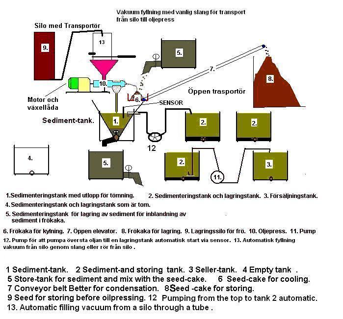 Fröet rinner in i pressen oljan rinner ned i ett sedimenterningskärl från detta kärl rinner oljan till en lagringstank. Från lagringstanken pumpas oljan till en försäljningstank/tappstation. För matolja godkänd lokal.
